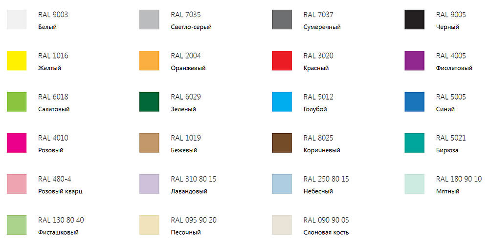 Цветовая гамма по каталогу RAL, состоящая из 16 цветов.